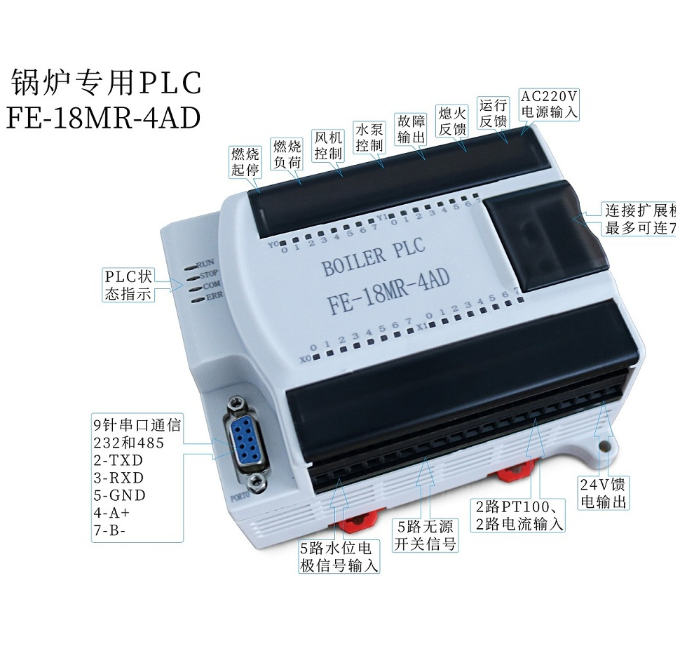 本公司專業致力于工業鍋爐自動化控制產品的研發,擁有一個專業開發可編程序控制器(PLC)的優秀團隊,根據鍋爐控制系統特性要求,結合多年從事鍋爐控制的經驗。已經開發出多款鍋爐專用PLC控制器,屬鍋爐自控行業首創。目前研發出第一代鍋爐專用PLC系列FE-13MR,FE-18MR4AD,FE-26MR7AD2DA,FE-40MR。FE-18MR4AD一體機,擴展模塊4款(FE-2DA3PT3AD、FE-2DA6PT、FE-2DA6AD、F...